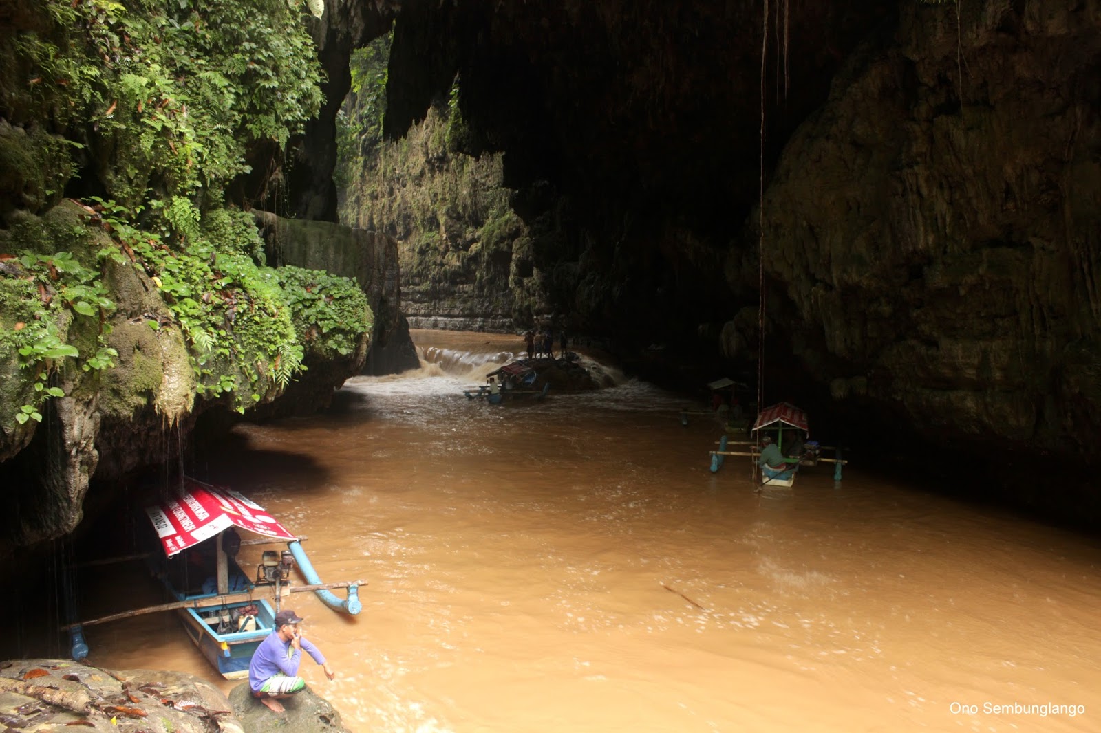 Selanjutnya ketika tiba di lokasi hujan baru saja reda setelah hujan yang deras semalaman. Sehingga hampir tak menemukan rasa berada di wilayah Green Canyon. Sebab air sungai nya sudah berubah warna menjadi kecoklatan. Padahal yang saya harapkan hijau hijau hijau hijau..selalu nampak dalam pandangan mata. Namun berkat penjelasan penduduk setempat bahwa hal ini merupakan hal yang biasa terjadi maka saya menerimanya dengan lapang dada.