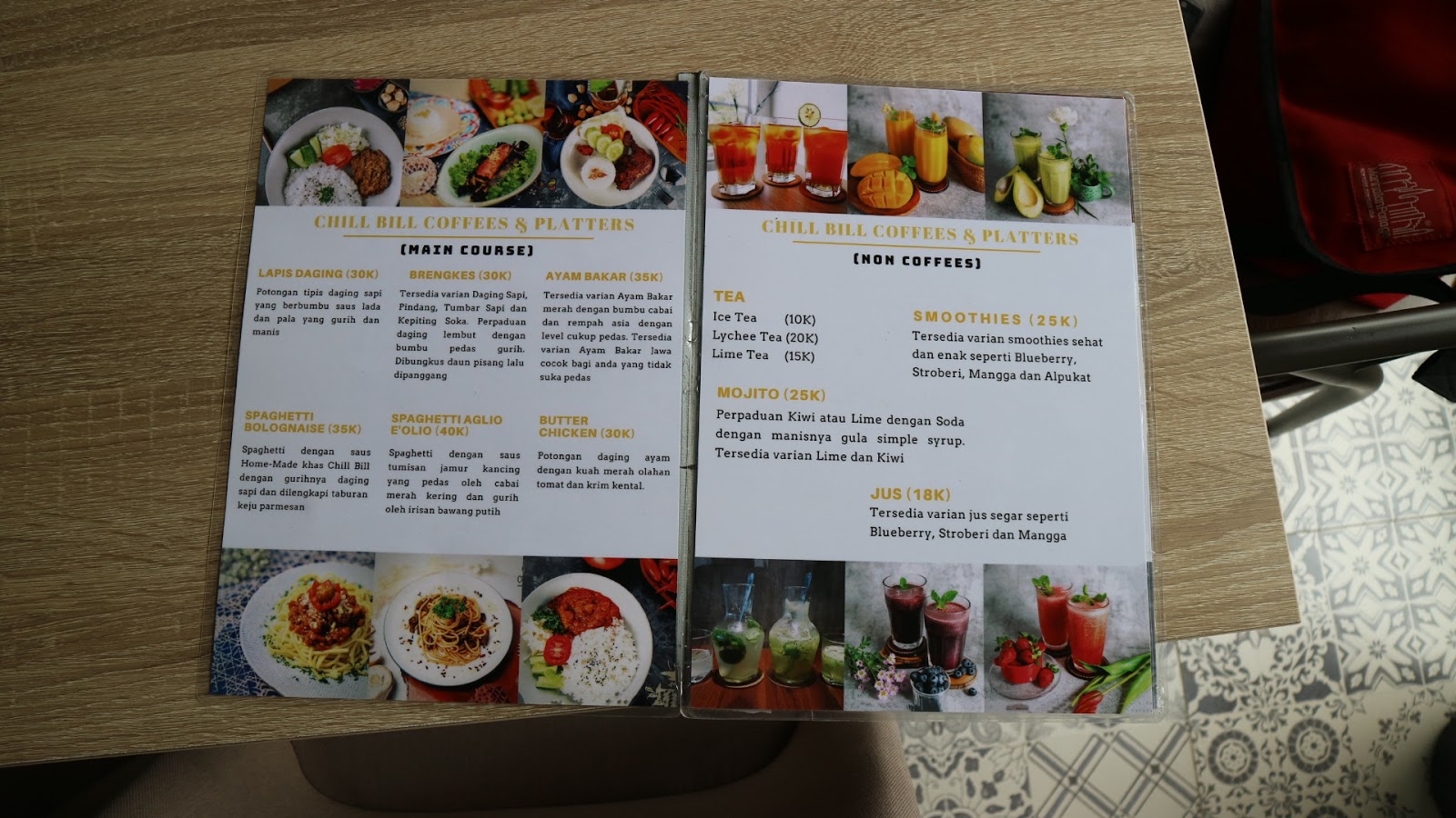 Mungkin bagi sebagian orang nama itu tak penting, yang penting rasanya. Eiitt tidak demikian menurut saya. Mas Putu dengan santai menjelaskan ihwal nama Chill Bill, Chill artinya lebih kepada ketulusan layaknya vibe anak-anak, kenaifan sebagian dari kejujuran rasa dari dapur. Sedangkan Bill diambil dari nama anak pemilik Chill Bill Cofees and Platters. Dua kata yang unik dan berpadu jadi tempat yang menjajakan kuliner Cofee dan Platters.